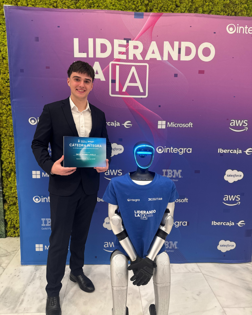Diego Romeo Lavilla, reciente graduado en el Máster de Dirección, Estrategia y Marketing, ha sido galardonado con el primer premio, otorgado por la “Cátedra Integra”, al mejor Trabajo Fin de Estudios gracias a su investigación: “Enamorado de Replika, ¿Qué hay más allá?”. Se trata de un reconocimiento que premia trabajos tanto de TFG como de TFM desarrollados en la Escuela de Ingeniería y Arquitectura (EINA) y en la Facultad de Economía y Empresa (FECEM) centrados en temáticas como la innovación, la inteligencia artificial, la sostenibilidad, la ciberseguridad o el impacto social de la tecnología.